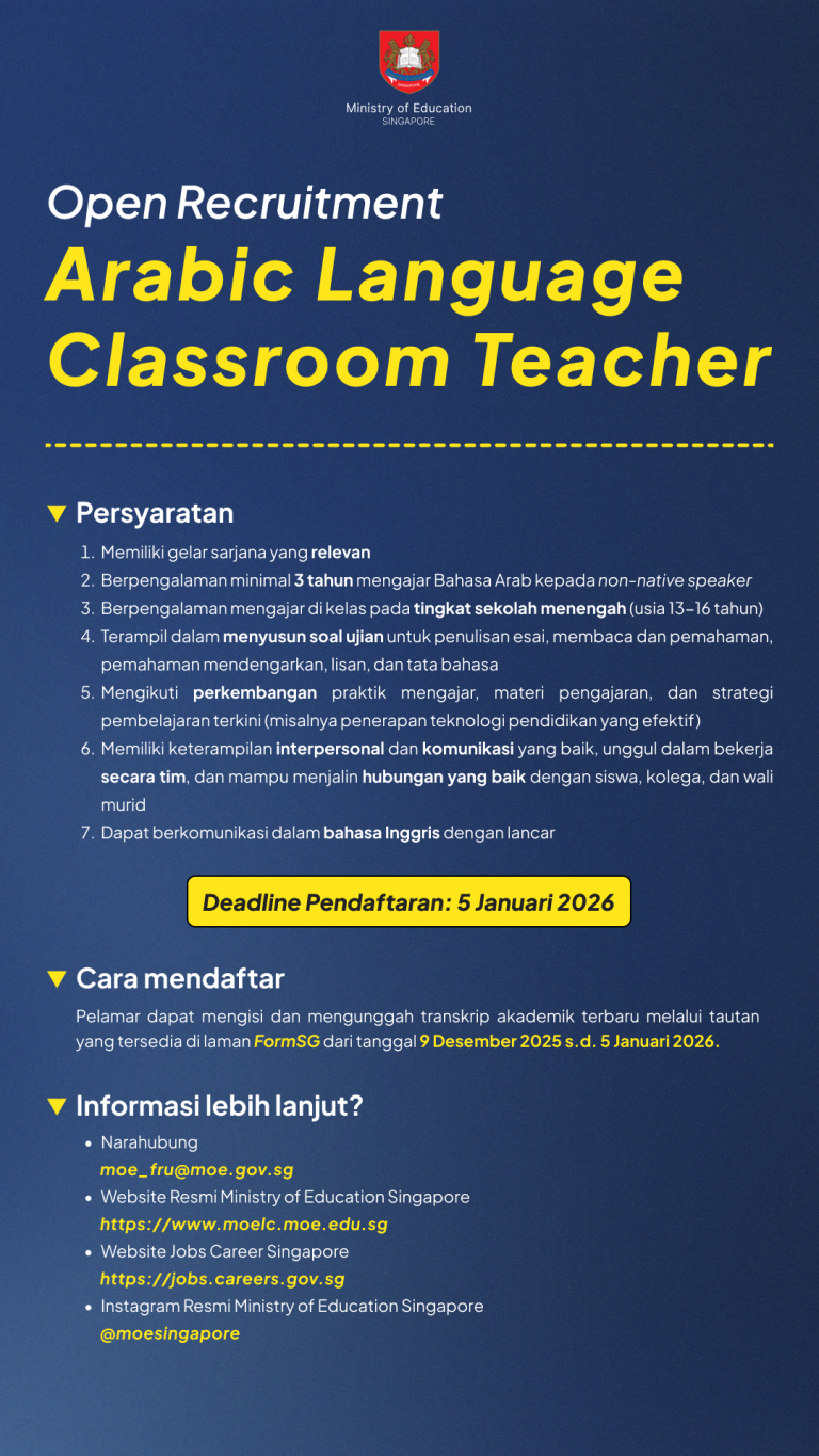Ministry of Education (MOE) Singapore sedang mencari guru bahasa Arab yang berdedikasi dan sangat termotivasi untuk bekerja di Pusat Bahasa MOE. Jika kamu memiliki gelar di bidang bahasa Arab, selain memiliki keterampilan komunikasi yang baik dan semangat mengajar, kami mengundang kamu untuk bergabung dalam tim kami sebagai guru bahasa Arab.